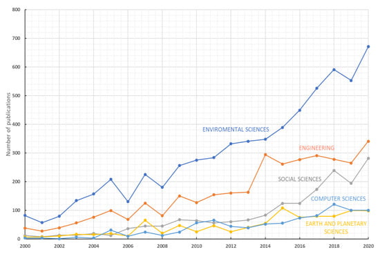If the evolution trend for the top five scientific categories from 2000 to 2020 is analyzed, Figure 5 is obtained. These top five subject categories amount to 81% of the total number of publications. This figure shows that Environmental Sciences and Engineering have always been the two predominant subjects. The other three, Social Sciences, Earth and Planetary Sciences, and Computer Science rank in a similar position till 2015 when Social Sciences has clearly distanced itself from the other two. Since 2015, the Scopus database shows that publications have been more focused on the social component of the water utilities as a basic service provider and the sustainable management of the resource supplied to their customers.