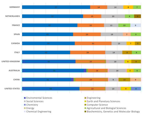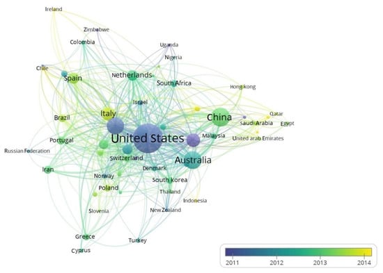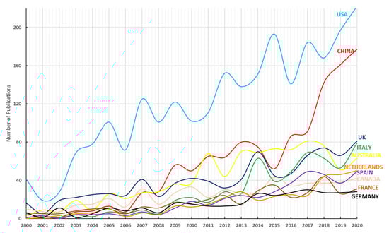 The evolution of the countries’ publishing clusters appears in Figure 10. The scale of the graph has been selected to show when new countries start to publish in this scientific field and make the graph relevant. Until 2010, the United States and Canada were the main countries that were already working on this subject. From 2011 onwards, the contribution from China, and the Netherlands became greater, followed by Spain and Italy.