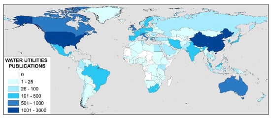 Table 1 shows the top ten countries in number of publications, pipe length, and the total amount of drinking water supplied. It clearly shows a connection between pipe length/total amount of water supplied and the number of publications. Pipe length and water supplied data have been collected from Europe’s water figure report [] and the Global Water Market report [].