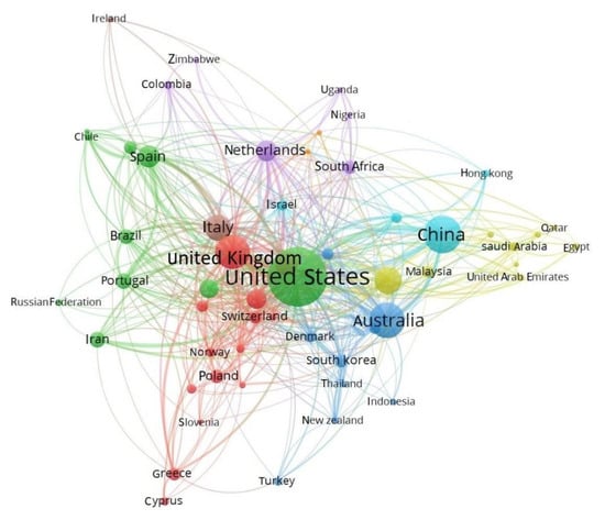 Networking investigation collaborations between the different countries are displayed in Figure 9. The number of publications is represented by the circle size and the color represents the cluster built up by countries working in the same group. The three main producers, the United States, China, and Australia are each leading a different cluster. Table 2 identifies the cluster and the main countries part of it.