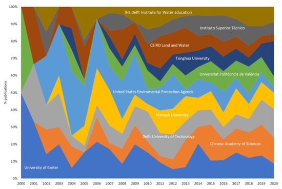 Below, Figure 11 shows the percentage of publications per year from 2000 to 2020 for the top ten institutions publishing in this science field. It is notorious to analyze how in 2020 only two institutions of the top ten had already started to work in this field. Progressively, more institutions have started to contribute with their investigations and for the last ten years, there is a common tendency for the sharing of publications among these top ten institutions.