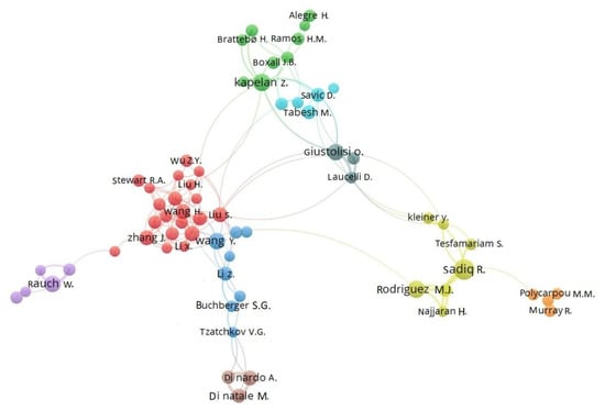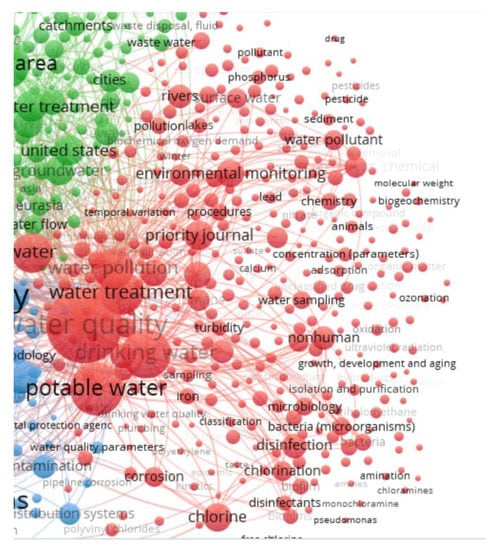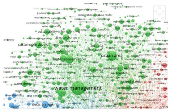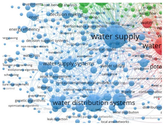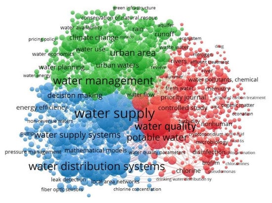 Finally, keywords cluster analysis permits the classification of the groups where research trends are grouped. Figure 14 shows the three clusters obtained and Table 5 summarizes them with the main keywords for each cluster. The main cluster, represented in red, deals with WDN quality. The second cluster, in green color, is focused on WDN management, and the last one, in blue, is centralized in the optimization of WDN.