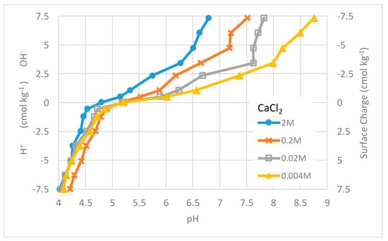 Figure 3 shows a typical point of zero charge for the soils of “Cerrado Biome” (pH = 5.2). Above the surface charge is negative and below it, the surface charge becomes positive [29].