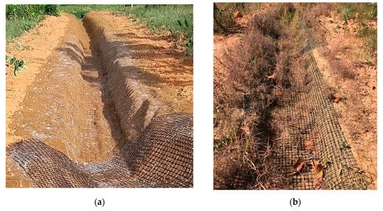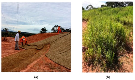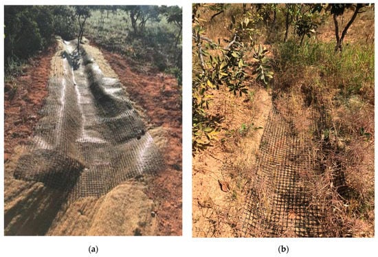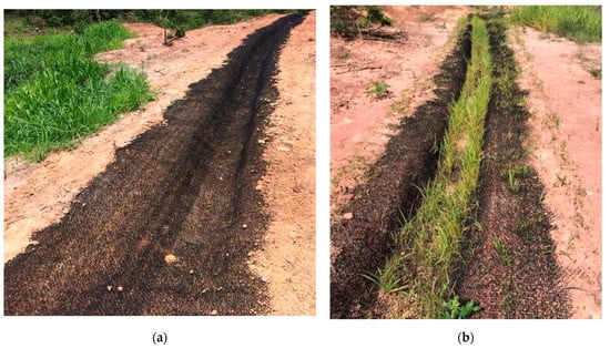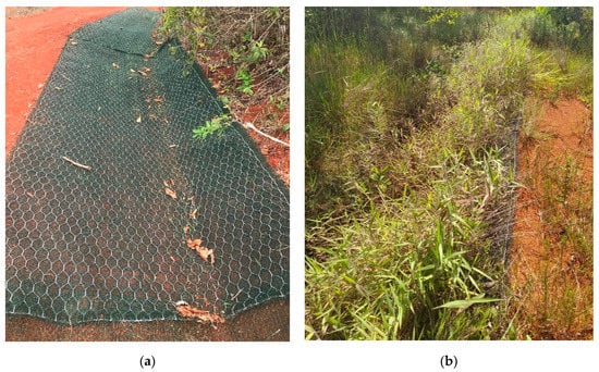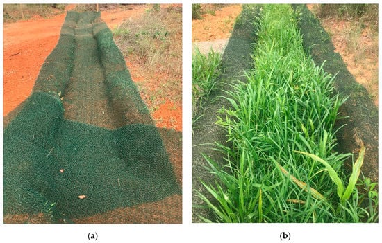 Drainage bioswales were installed in 20 experimental parcels with different types of revetments. Each bioswale had a trapezoidal cross section with a top width, bottom width and height of 1.5 m, 0.6 m and 0.5 m, respectively, and a length of 10 m. Eleven experimental parcels were installed in Site 1 (São Gonçalo do Abaeté), and nine in Site 2 (Córrego Dantas). Each experimental parcel was planted with seeds of the following species: Urochloa umidicola, Urochloa decumbens, Hypharrenia rufa, Crotalaria juncea, Melinis minutiflora, and Avena strigose. A total of six commercially available rolled erosion control products (RECPs) from three different manufacturers (Deflor [33], Maccaferri [34], and Tensar [35]) and one RECP that was specifically developed for this study—the preseeded reinforcement mat—were used as swale revetments in the experimental parcels: