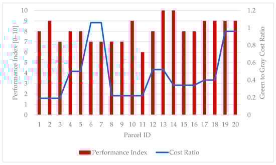 Comparison of performance index and green to gray cost ratio for all experimental parcels in Sites 1 and 2.