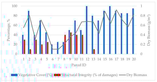 Figure 13 shows the correlations between the type of vegetative cover, structural integrity and dry biomass of the 20 experimental parcels located in Study Sites 1 and 2. As expected, the structural integrity (measured as percent damage) of swales was inversely proportional to the vegetative cover percentage, with a Pearson correlation factor of −0.51.