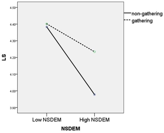 As shown in Table 8, when NSDEM was used as an independent variable only in Step 1, the total variance explained (R²) was 17.4%. NSDEM exerted a significant effect on LS (p < 0.001). In Step 2, the addition of the moderator increased the total variance to 17.8%, and the increase in the variance was significant (F = 9.674, p < 0.001); therefore, gathering exerted a significant moderating impact. As a result of applying the interaction variable in Step 3, the total variance increased to 18.9%, and NSDEM had a significant effect on LS (F = 8.923, p < 0.001). Therefore, the regression model was statistically significant. Because the interaction variable ‘NSDEM × gathering’ had a t-value of (+)2.405, informal gatherings had a positive effect on the participants with high NSDEM compared to those who had low NSDEM with regard to LS. Therefore, this result can be interpreted to indicate that the effect of gathering is high in the group with high NSDEM. The results of the analysis of the impact of NSDEM on LS are presented in Table 8 and Figure 2.