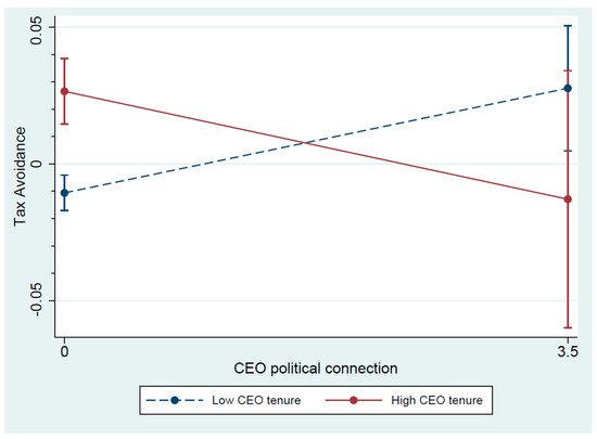 Concerning the competing hypotheses, the estimated coefficient of the interaction term between CEO political connections and CEO tenure in Model 3 was statistically significant with a negative sign (β = −0.006, p < 0.05). This indicates that CEO political connections mitigated risk-taking tendencies for tax avoidance as tenure increased. Therefore, among the competing hypotheses, Hypothesis 2b was supported while 2a was not. Figure 1 depicts the negative moderating role of CEO tenure.