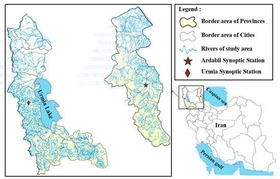 This study was conducted to investigate the capability of the developed support vector machine (SVM) model to predict monthly rainfall (R) at Ardabil station and monthly pan evaporation (EP) at Urmia station, with the effect of the month number (τ) characteristic within the scenarios. For this purpose, these two stations will be introduced first. In order to predict the monthly R and EP, in this study, the monthly rainfall information from Ardabil meteorological station and the EP information from Urmia meteorological station were used. Ardabil and Urmia, as the provincial capitals of Ardabil and West Azerbaijan, are located in Iran, in the mountainous region, and have a semi-arid and cold climate. Additionally, in these areas, rainfall has a disproportionate seasonal distribution. Thus, most of the rainfall, whether in the form of rain or snow, occurs in the autumn–winter and spring seasons. Ardabil meteorological station is located at an altitude of 1335 m above sea level, with a longitude of 47° and 2′ and latitude of 38° and 13′, and Urmia meteorological station has a latitude of 37° and 32′ and a longitude of 45° and 5′, and an elevation of 1316 m. They are both located above sea level. Figure 1 shows a visual view of the geographical location of the meteorological stations under study.
