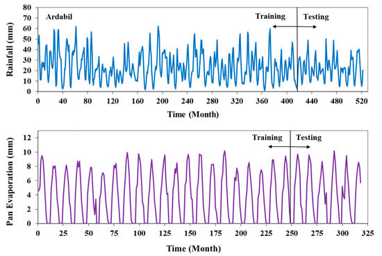 In this study, rainfall (R) data of Ardabil meteorological station, on a monthly basis in the statistical period 1976–2019, and pan evaporation (EP) data of Urmia meteorological station, on a monthly basis in the statistical period 1993–2019, were obtained from the Meteorological Organization. Data were divided so that 80% of the data were isolated for training, and 20% for the testing phase. To be more precise, out of the total 522 months of R data of Ardabil station, 417 months were considered for training (1976–2010), and 105 months for testing (2019–2011). For modeling the EP of Urmia station, out of the total number of 318 months of EP data, 249 months (2013–1993) were considered for training, and 69 months for testing (2019–2014). Figure 2 shows the data segmentation diagram for predicting R and EP at Ardabil and Urmia stations in two sections: training and testing. Table 1 shows the statistical characteristics (minimum, maximum, mean, standard deviation and skewness) at Ardabil and Urmia stations for the training and testing datasets. In order to investigate the different input and output modes of the smart model, cross-correlation analysis was performed between the types of modes. The visual view obtained from the study of the interrelationship of inputs and outputs for the monthly rainfall of Ardabil station and monthly EP of Urmia station is shown in Figure 3.