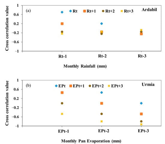 Cross-correlation analysis plots between input and output variables at (a) Ardabil and (b) Urmia stations.