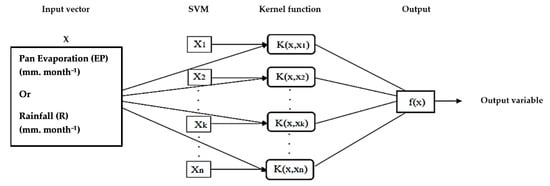 In order to determine the input of the SVM model, with the aim of predicting the current and lead times of one–three monthly rainfall (R) and pan evaporation (EP) events, the cross-correlations of lag times (Rt−1, Rt−2, Rt−3 or EPt−1, EPt−2, EPt−3) against the target months (Rt, Rt+1, Rt+2, Rt+3 or EPt, EPt+1, EPt+2, EPt+3) were examined, and the results are shown in Figure 3. Therefore, for rainfall, various combinations of lag times to predict the current and lead times of one–three monthly rainfall (R) events were considered as the input of the SVM model and are listed in Table 3 and Table 4. For each of the predicted time steps, we have a total of six scenarios. Of these six scenarios, three scenarios are shown in Table 3, and three scenarios are shown in Table 4. The scenarios in Table 3 show the different combinations of rainfall (R) lag times as input to the SVM model. According to the scenarios in Table 4, in addition to lag times, the month number (τ) was placed as an input next to other inputs to check the results of the scenarios without and with the month number. This is also true for the prediction of pan evaporation (EP), which can be seen in Table 5 and Table 6.