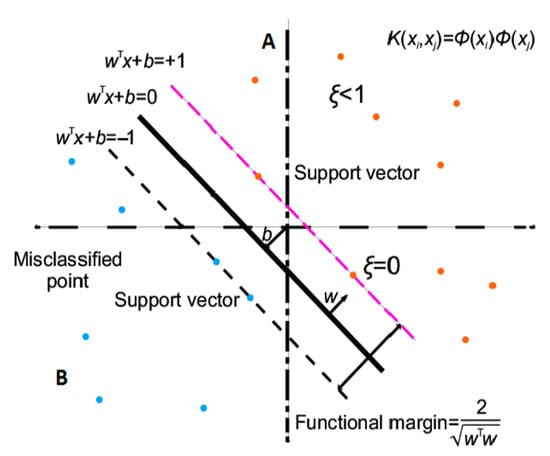 According to Figure 5, the continuous bold line with the equation wT x + b = 0 is known as the line separating the data on the plane and divides them into two categories, A and B. This line leads to the formation of a space in which the data belonging to category A take a positive number and the data belonging to category B take a negative number. However, in SVM models, in addition to using the delimiter line, a confidence margin is also used for classification (Figure 5). In this case, none of the data are allowed to be in the middle area. Assuming that the line with the equation wT x + b = 0 is a boundary zero point, then for the data, depending on the position in classes A and B, respectively, the equations wT x + b > 1 and wT x + b < −1 are established. The thickness of the separator in the SVM includes an area and makes the classification process more resistant to the risk of misalignment [27].