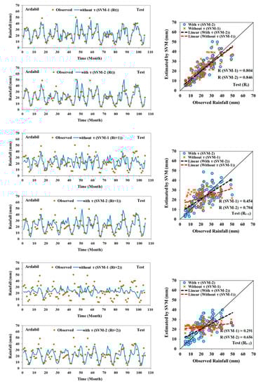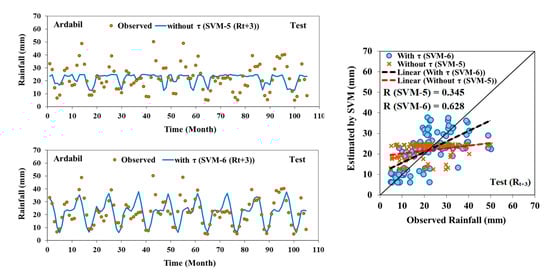 In the next step, considering the month number (τ) as input within scenarios 1, 3 and 5 (SVM-1, SVM-3, SVM-5), new scenarios 2, 4 and 6 (SVM-2, SVM-4, SVM-6) were obtained. New scenarios were introduced as input to the SVM model. The results of the statistical indicators obtained from the new scenarios are shown in Table 4. According to Table 4, it is generally observed that the results in all time steps significantly improved compared to the case where the month number (τ) was not among the inputs. In Table 4, and the current time step (Rt), scenario 2 (SVM-2), with inputs (τ, Rt−1, Rt−2, Rt−3) and the lowest RMSE = 5.815 mm. month−1, showed the highest values of KGE = 0.845 and CC = 0.846 compared to scenarios 4 and 6 (SVM-4 and SVM-6); compared to the result of the superior scenario 3 (SVM-3) related to the current time step (Rt) in Table 3, we saw an improvement of 6.7, 4.7 and 3.8% in the RMSE, KGE and CC statistical indices, respectively, in the case that the month number (τ) was considered as input in the scenarios. In the next time step, i.e., rainfall for the upcoming month (Rt+1), scenario 2 (SVM-2), with RMSE = 7.974 mm. month−1, KGE = 0.703 and CC = 0.704, was selected as the best scenario in this time step, and the RMSE, KGE and CC indices improved by 16.6, 129 and 60.7%, respectively, compared to the best scenario 3 (SVM-3) for the month number (τ). According to Table 4, scenario 2 (SVM-2), as the best scenario, with the lowest RMSE = 8.148 mm. month−1 and the highest values of KGE = 0.623 and CC = 0.656, compared to the other scenarios, was selected to predict rainfall for the upcoming two months (Rt+2) at Ardabil station. In this time step, we also saw a 19.1, 858 and 125% improvement in RMSE, KGE and CC values, respectively, compared to the best scenario 1 (SVM-1) in the case without τ in the same time step (Table 3). In the last target time step, i.e., the upcoming three months of rainfall time step (Rt+3), scenario 6 (SVM-6), with RMSE = 8.411 mm. month−1, KGE = 0.587 and CC = 0.628, was identified as the best scenario, and we saw an improvement of 12.4, 313 and 56.6% in RMSE, KGE and CC statistical indices, respectively, compared to the best scenario in Table 3.