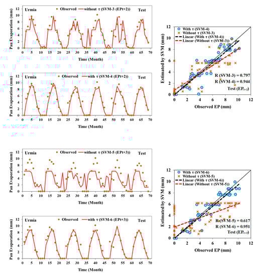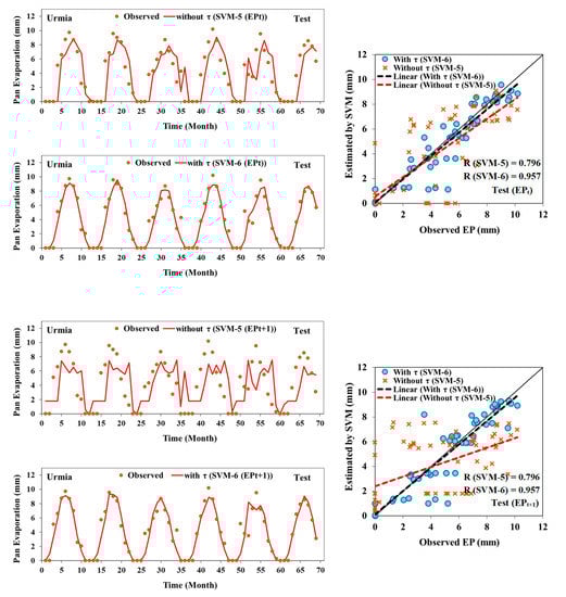 In order to investigate the changes in the case of a simple characteristic such as the month number (τ) in the time delay input scenarios for the monthly estimation of another parameter except rainfall, the SVM model was implemented for the monthly pan evaporation (EP) of Urmia station. Initially, in order to predict the evaporation from the EP of Urmia station for four time steps (current month, and upcoming one, two and three months), the SVM model was implemented for scenarios that do not have the month number (τ), and the results of the statistical indicators obtained from this work are listed in Table 5. According to Table 5, in estimating the evaporation from the current lunar pan (EPt), scenario 1, with inputs of one-, two- and three-month lag times of EP (EPt−1, EPt−2, EPt−3), had the lowest RMSE = 1.666 mm. Month−1 and the highest values of KGE = 0.844 and CC = 0.889, compared to other scenarios, and it should be selected as the best scenario in this time step. In predicting EP with the aim of predicting the time step of the upcoming month (EPt+1), again, scenario 1 (SVM-1), with RMSE = 1.751 mm. month−1, KGE = 0.845 and CC = 0.866, showed better accuracy in this time step. In a step ahead of time, i.e., predicting EP for the upcoming two months (EPt+2), scenario 1 (SVM-1), due to having the lowest value of RMSE = 1.603 mm. month−1 and the highest values of KGE = 0.85 and CC = 0.888, appeared more successful than the other scenarios in this time step. In the last step, for the prediction of EP for the upcoming three months (EPt+3), again, scenario 1 (SVM-1), as the best scenario, with RMSE = 1.339 mm. month−1, KGE = 0.846 and CC = 0.93, was selected. As a result, based on the results of Table 5, it is observed that unlike rainfall, in predicting EP with increasing time steps, the accuracy of the SVM model did not decrease much, and the model has a good accuracy. Even the upcoming three months’ time step of EP (EPt+3) was able to achieve the best result in the same scenario 1 (SVM-1) compared to the current month’s time step (EPt), and this is interesting. Additionally, scenario 1 (SVM-1), with inputs of one-, two- and three-month lag times of EP (EPt−1, EPt−2, EPt−3), could be selected as the best scenario in all time steps; other scenarios that were examined were not better than that.