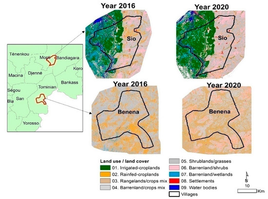 Figure 2 shows the spatial maps for the years 2016 and 2020 indicating the major land-use classes at two study sites, Sio and Benena. The major classes are irrigated croplands and rainfed croplands; the others are mixed due to the complexity of the LULC pattern and also the water bodies. Sio has irrigated croplands, wetlands and water bodies whereas Benena has rainfed croplands and a mixed class of rangelands and croplands.