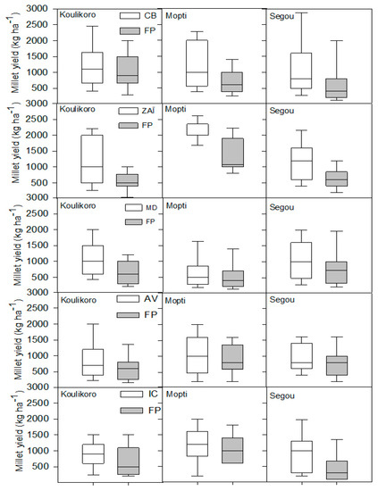 In the treatment with the adapted variety of millet, yields from the 50% trial varied from 450 kg ha−1 to 1200 kg ha−1 in Koulikoro and Segou and from 500 kg ha−1 to 1200 kg ha−1 in Mopti (Figure 3). For farmers’ practice, yield from the 50% trial varied from 350 kg ha−1 to 450 kg ha−1 in Koulikoro and Segou and from 600 kg ha−1 to 1200 kg ha−1 in Mopti. The mean yield obtained under the AV treatment was 1010 kg ha−1, which was significantly higher (p < 0.001) than that obtained under farmers’ practice, with a yield gain of +213 kg ha−1. This difference applied to all three studied regions (Table 3).