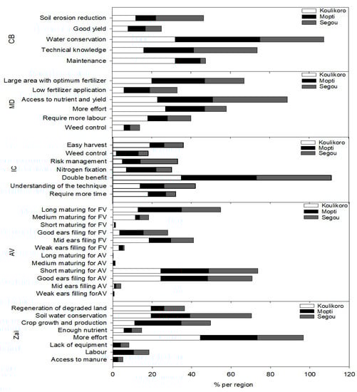 Farmers’ perceptions on various technologies in the Koulikoro, Mopti and Segou regions of Mali. (CB: Contour bunding; MD: Microdosing; AV: Adapted variety; IC: Intercropping; FP: Farmers’ Practice).
