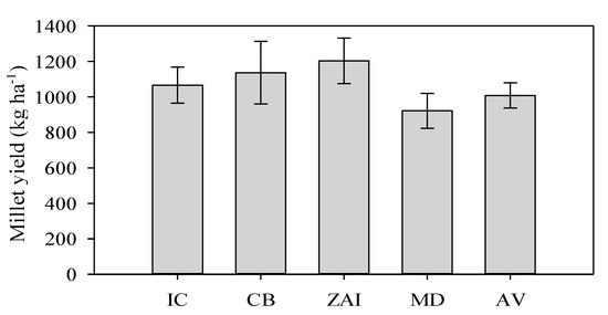 Except for the significant yield gains from the application of the Zaï and MD technologies, the other CSA technologies produced similar millet yields in the studied regions. However, this result differed from farmers’ own ranking of the technologies, in which adapted varieties ranked first followed by the microdosing technology. This indicates that absolute yield is not necessarily the principal technology selection indicator for farmers. Farmers tend to select a technology that requires less effort, labor and financial resources—which is particularly due to the fact that the majority of farmers do not have the required farming equipment [50].