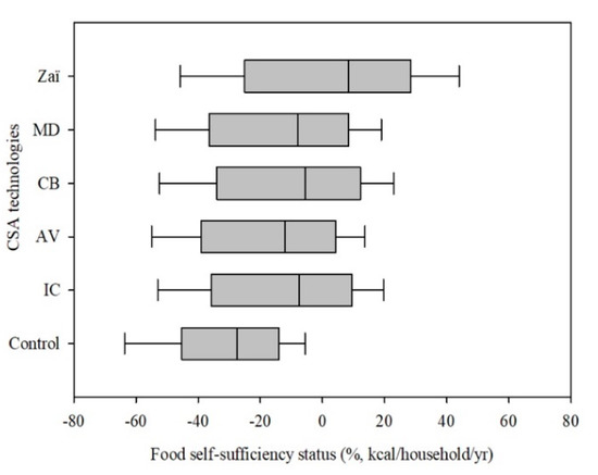 With regards to the contribution of CSA technologies to improving household food self-sufficiency, we can infer that the current food production system in the Sahelian zone must evolve to adapt to current constraints, especially to face climate change and variability. This aligns with the Food system transformation initiative [56] led by the CGIAR Research Program on Climate Change, Agriculture and Food Security (CCAFS), under which climate smart agriculture (CSA) has a key role to play in driving change through innovative actions that mainstream the three pillars (productivity/adaptation/mitigation) in an effective way [24].