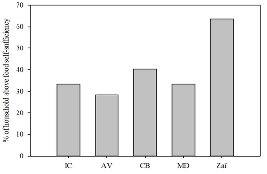The food self-sufficiency status of 376 households in the three regions was analyzed and results showed high variability (Table 5). Over the studied regions, 27% of households were found to be food-insufficient, with a mean of −32% recorded, which corresponds to an average availability of 1687 kcal per person per day. On the other hand, 274 households were found to be food self-sufficient, with a surplus food stock (+98%), corresponding to an average availability of 4928 kcal per person per day.