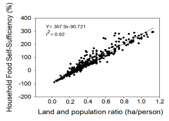 Regression between Household Food Self-sufficiency status (%) and land population ratio.
