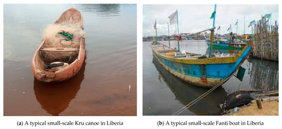 Since 2010, the SSF have had exclusive access within a six nautical mile inshore exclusion zone (IEZ), although they may also fish further offshore [11]. The majority of SSF consist of non-motorized dugout canoes averaging about 6.7 m with 1–4 crew, operated by local Kru fishers (Figure 1a). However, in practice Kru fishers may be a mix of people comprising Kru, Vai, Bassa, Grebo and other tribes [3].