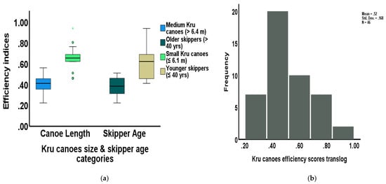 The technical efficiency score for the Kru canoes averaged 0.53 ± 0.12 and seems to follow observation for SSF fishers elsewhere [31]. The efficiency indices for the Kru canoes significantly decreased (p < 0.00) along with an increase in canoe length, which may be attributed to the cost of larger canoes and skipper age (Figure 3a). This suggests that small Kru canoes (≤6.1 m) and younger skippers (≤40 years) are more efficient than larger canoes (>6.1 m) and older skippers (>40 years). About 46% of the observed Kru canoes’ technical efficiency score ranged between 0.41 and 0.60, followed by 28% of the canoes with efficiency indices in the range 0.61–0.80 (Figure 3b), indicating that most of the Kru canoes are inefficient.