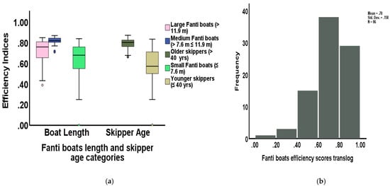Differences in technical efficiency and frequency distribution of efficiency: (a) Differences in technical efficiency scores across Fanti boat size and skipper age. (b) Frequency distribution of efficiency indices for small-scale Fanti boats in Liberia.