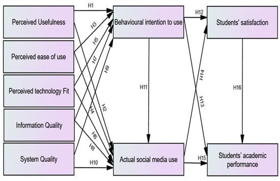 The behavioral intention to use is “understood as an individual intention to continue or use technology, including factors that influence any use of technology” []. Thus, in this study, students’ learning performance is determined by their behavioral intention to use social media and the actual social media usage that enriches their learning. Moreover, studies using the TAM theory found behavioral intention increased actual social media usage [,]. These theories were all expanded from the core of Theory of Reasoned Action (TRA), which asserts that social media use is a function of attitude toward particular standards; later, this was expanded to include seeming control, dubbed Theory of Planned Behavior (TPB) []. Furthermore, PU and PEOU might be taken for granted, depending on what a habitual user believes, leading to better user satisfaction and continuous intent []. Some researchers discovered that those who enjoy using social media will deliberate their connection with that system completely and build superior behavioral social media use []. Research conducted by [] concluded that behavioral intention is related to students’ intention to use social network platforms daily and continue using them in the future. Meanwhile, the authors of [] and [] suggested that behavioral intention directly impacts the usage of social network platforms for learning. The key explanation of models/theories regarding technology usage is the users’ intention to use the social network and other system applications [,,].