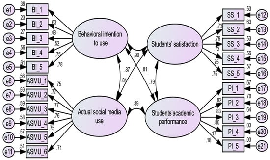 This study aimed to determine factors influencing behavioral intention to use and the actual social media use for learning while also considering students’ satisfaction and academic performance. The results show that all the variables met the Cronbach’s alpha coefficient criteria ranging between 0.70 and 0.90. Cronbach’s reliability coefficient was 0.976, which is discussed in the reliability analysis. The study also tested the discriminant validity according to three criteria in which the index value of the variable was below 0.80 []; second, the average variance extracted (AVE) rate was assumed to be equal to or greater than 0.5; and third, the AVE square was greater than the factors-related inter-construct correlations (IC) []. In addition, confirmatory factor loadings were equal to or greater than 0.7. Finally, the Cronbach’s alpha and composite reliability rating equal to or greater than 0.70 were accepted [].
