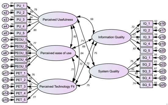 The SEM used in this study as a key statistical tool was AMOS 23 to evaluate the outcomes based on confirmatory factor analysis (CFA). This model analyzed discriminated validity, consistency, and the one-dimensionality as being overconvergent. Hair et al. [] suggested that the score model should be measured using goodness-of-fit strategies, such as the chi-square, standard chi-square, the incremental fit index (IFI) = 0.926 and the relative fit index (RFI) and Tucker–Lewis coefficient (TLI). The model fits well with the comparative fit index (CFI) equal to or greater than 0.90. In addition, the root-mean-square approximation error (RMSEA) satisfies the proposed criterion as suggested by [], which is less than or equal to 0.08 to support the required suit; the residual root means quarter residual (RMR). Table 3 shows an overview of the goodness-of-fit indices used for model assessment and the dependent variables and measurement of the mediator mentioned in Figure 2. Figure 3 displays the TAM theory of measurement.