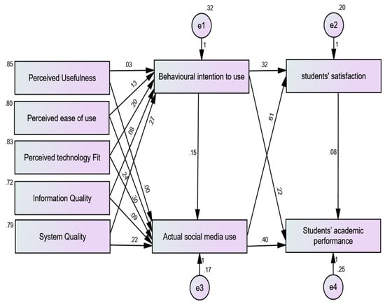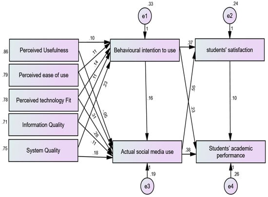 Table 5 presents the findings of validity and reliability for female students on aca-academic performance through TAM. After analyzing CFA and verifying that each construct of the research model had a high value of reliability, the next step was to evaluate the model using the structural equation modeling (SEM) technique and overall goodness-of-fit relationships between variables. The suitability indexes that confirm the model, specifically, CR and CA (write in full), met all the requirements and AVE were all accepted, as shown in Table 5; thus, the validity of discriminants was also established. Furthermore, the obtained values of the composite reliability are presented in Table 5, which were in the range from 0.807 to 0.925. In addition, Cronbach’s alpha values were in the range from 0.832 to 0.904, all above 0.70. Furthermore, the AVE values were also in the range from 0.582 to 0.630, meeting the required criteria of 0.50. This means that all loading factors were significant and passed the recommended value of 0.50, and hence, they satisfy the presented correlations [,,,]. Based on the findings, all the hypotheses were supported by the 16 key constructs as shown in Figure 5. In the current study, female students always perceived usefulness towards their peers, leading to behavioral intention to use social media (0.04-H1); female students perceived usefulness towards their peers, leading to actual social media use on social networks (0.43-H2); female students perceived ease of use with peers, which leads to behavioral intention to use social networks (0.41-H3); female students perceived ease of use with peers, which leads to actual social media use (0.30-H4); female students perceived technology fit with their peers, which leads to a behavioral intention to use social networks (0.33-H5). Moreover, female students perceived technology fit with peers, which leads to actual social media use on social networks (0.22-H6); female students believe information quality with peers, which leads to behavioral intention to use social networks (0.31-H7); furthermore, female students believe they have information quality with peers, which leads to actual social media use on social network platforms (0.51-H8); female students believe that they have system quality with peers, which leads to behavioral intention to use social networks (0.41-H9); female students believe that they have system quality with peers, which leads to actual social media use on social networks (0.22-H10). Additionally, female students believe that there is behavioral intention to use social media with peers, which leads to actual social media utilization on social networks (0.13-H11); female students believe that there is behavioral intention to use social media with peers, which leads to students’ satisfaction with using social networks (0.13-H11); female students believe that there is behavioral intention to use social media with peers, which leads to students’ increased academic performance on social network platforms (0.13-H11); female users believe that actual social media usage with peers leads to students’ satisfaction using social network platforms (0.13-H11); female students believe that proper social media use with peers definitely leads to students’ increased academic performance using social network platforms (0.13-H11); finally, female students believe that students’ satisfaction with peers leads to students’ increased academic performance using social network platforms (0.13-H11), (0.59-H12). The results obtained using the model are presented in Figure 5 and Table 5.