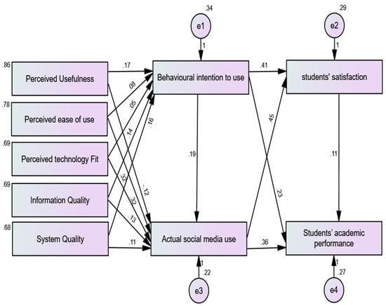 Table 4 presents the validity and reliability findings of the male students’ academic performance examined using TAM. After analyzing the CFA and verifying that each construct of the research model possessed high reliability, the next step was the structural model analysis. Structural equation modeling (SEM) is used to evaluate the model to determine the overall goodness-of-fit relationships between variables. The suitability indexes that confirm the model, specifically CR and CA, met all requirements and the AVE were accepted, as shown in Table 4. The discrimination validity was also established. The composite reliability values were in the range of 3.139 to 4.181, as presented in Table 4. In addition, Cronbach’s alpha values ranged from 0.749 to 0.907; all values above 0.70 were accepted. Moreover, the AVE ranged from 0.363 to 0.570, exceeding the calculated value of 0.50. This means that none of the loading factors were insignificant and exceeded the value of 0.50; hence, this suggests correlations [,]. All the hypotheses supported by the 16 key constructs are shown in Figure 4. In this present study, male students have perceived usefulness towards peers, leading to behavioral intention to use (0.03-H1); male students also have perceived usefulness towards their peers, leading to actual social media use of social networks (0.00-H2). Moreover, male students believe that perceived ease of use leads to use of social networks with peers (0.13-H3); male students believe that perceived ease of use leads to actual social media use with peers on social networks (0.30-H4); male students believe that perceived technology fit with peers leads to a behavioral intention to use social networks (0.20-H5); male students believe that perceived technology fit leads to actual social media with peers using social networks (0.24-H6), male students believe that information quality leads to behavioral intention to use social networks with peers (0.26-H7); male students have information quality with peers, which leads to the actual social media usage of social network platforms (0.09-H8); male students believe that system quality leads to behavioral intention to use social networks with peers (0.27-H9); male students believe that system quality leads to actual social media usage with peers (0.22-H10), male students believe that behavioral intention leads to actual social media use with peers (0.15-H11).