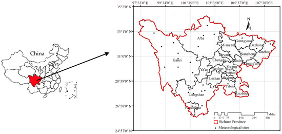 A ‘nowcast’ from China’s Meteorological Data Sharing Service System was used to obtain up-to-date meteorological data from 1984 to 2011 (http://data.sheshiyuanyi.com/WeatherData/, accessed on 5 March 2020). It included a total of 33 meteorological sites in the Sichuan province (Figure 1). The meteorological data included the daily average temperature, maximum temperature, minimum temperature, average wind speed and daily rainfall from 1984 to 2011.