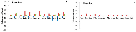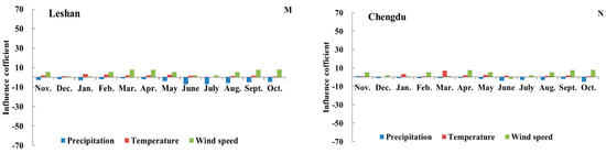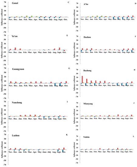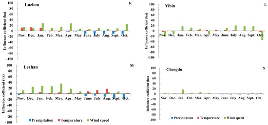 Temperature and precipitation affect the moisture content of fuel and the distribution of vegetation, influencing the occurrence and development of forest fires. Wind speed is the decisive factor that restricts the rate of spread, fire intensity, area burned and fighting difficulty of forest fires. Figure 3 and Figure 4 show that the influence coefficients of wind speed, temperature and precipitation from January to December and their leading roles were different in the grade I wildfire danger region of the Sichuan province. The impact on the number and areas burned by forest fires in different climatic regions varied and the dominant meteorological factors were constantly changing. In a given period, it was mainly affected by temperature while in other periods it was affected by precipitation or wind speed. The increase or decrease in the number and area burned due to the influence of wind speed, temperature and precipitation depended on meteorological factors that played a leading role for a given month or on the results of the interaction among precipitation, temperature and wind speed. There were differences in the responses of the number and area burned to monthly changes of wind speed, temperature and precipitation in the same administrative region.