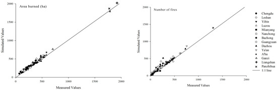 Table 1 summarizes that the coefficients of determination (R2) of the fitting function for the number and area burned in each administrative region were greater than 0.900. With the exception of the poor effect of the model significance in Chengdu, the other city models passed the significance test of p < 0.05, which showed that the integral regression model showed a high accuracy in establishing a multivariate model for a forest fire response to climate change. Figure 5 shows that the difference between the simulated and measured values of the integral regression model was small and basically distributed on or near the 1:1 line; however, the predicted values were slightly larger. The results showed that the integral regression was reliable for studying the response of the number and area burned to the changes of multi-meteorological elements in different months over 14 grade I forest fire danger regions in the Sichuan province and it could be used to predict the response of forest fires to future climate change.