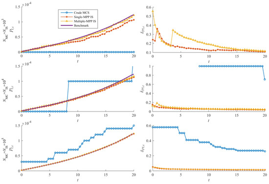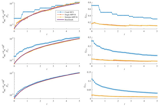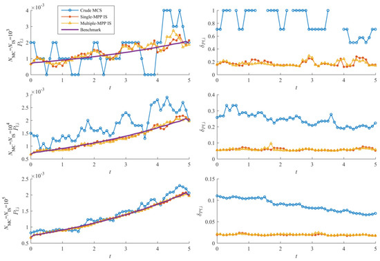 Figure 1 shows lines of and the corresponding coefficient of variation () obtained using crude MCS and the proposed IS. In each row of Figure 1, the size of the random population associated with the methods are the same in order to visualize the advantage of the proposed IS as well as the difference between single-MPP IS and multiple-MPP IS. According to Figure 1 and Table 1, the efficiency of crude MCS and the proposed IS are close in terms of estimating . However, the proposed IS outperforms with respect to estimating the evolution of over the time interval of interest. Multiple-MPP IS is capable of efficiently providing an accurate evolution of ().
