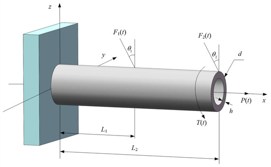 A cantilever tube structure, modified from a previously published example [18,23], is studied in this section. It is adopted herein to investigate the performance of the proposed IS when involving multiple stochastic processes. As shown by Figure 6, four time-variant loads, i.e., F1(t), F2(t), P(t) and T(t), are applied to the cantilever tube. The yield stress is considered to linearly decrease over time resulting from the material degradation. The decreasing model is: