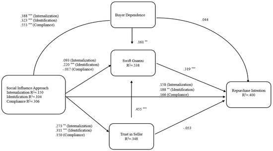 Regarding the effects of the social influence approach, the identification approach significantly increased buyer–seller swift guanxi (β = 0.220, p < 0.000) and repurchase intention (β = 0.188, p < 0.01). Moreover, the identification (β = 0.311, p < 0.000) and internalization (β = 0.273, p < 0.01) approaches significantly increased trust in the seller. Thus, H4-2, H5 and H6-2 are supported. The compliance approach exerted no effect on buyer–seller swift guanxi, trust in the seller and repurchase intention. The results confirm that the compliance approach did not promote the buyer–seller relationship quality (i.e., buyer–seller swift guanxi and trust in the seller) and repurchase intention. We speculate the normative influence and feeling of being potentially punished or being threatened could be the main reasons [25]. Moreover, the seller’s internalization approach did not enhance buyer–seller swift guanxi and repurchase intention. Thus, the respondents did not recognize the seller’s efforts in implementing internalization approaches, which led to them not experiencing buyer–seller swift guanxi. Furthermore, the seller’s internalization messages did not induce the buyer’s repurchase intention, showing inconsistent results with previous studies [23,24]. The buyer can access information and knowledge of products from the Internet, and customer opinions and reviews in social media, and that might cause no significant effect of the seller’s internationalization approach due to the information competition effect [53].