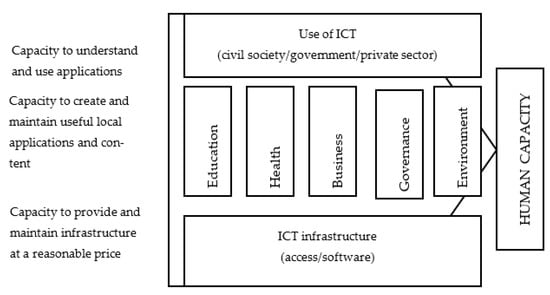 Osterwalder [] found that ICT-related capacities can be divided into three main types: (1) infrastructure-related capacities; (2) sector application-related capacities; and (3) user-related capacities (See Figure 1). First, ICT can only flourish in case there is sufficient capacity to provide and maintain ICT infrastructure at a reasonable price in a sustainable way. Second, ICT can only become valuable to people when useful local content is available. Therefore, a new class of entrepreneurs is needed that focuses upon developing the capacity to imagine, create, and maintain useful applications in different sectors that make sense to the local community. Finally, users should develop the capacity to understand and to use ICT []. More specifically, as latecomers to the ‘ICT scene’, developing countries are facing enormous difficulties of which perhaps the most important being that they are becoming users of ICT without having built up the necessary capacities [,,].