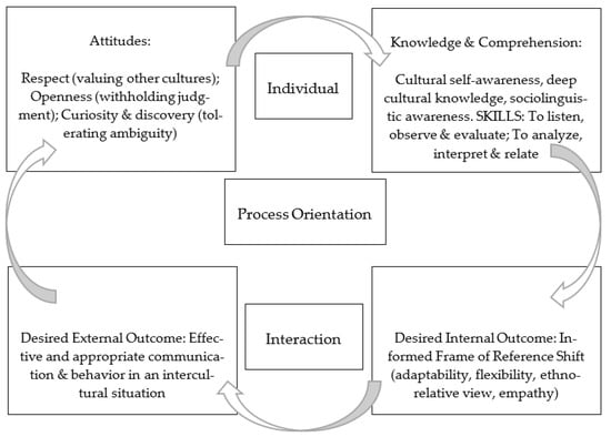 Let us take a closer look at the [] model. The visual representation of this Process Model of Intercultural Competence, originally developed by [] (see Figure 2), forms a more accessible representation of long-fragmented lists, by placing components of intercultural competence within a visual framework that can be entered through various levels of the model. Attitude is a fundamental starting-point [] as illustrated in this visual representation. It has been referred to as the affective filter in other models [], although this filtering process differs from one person to another. Moreover, attitude will vary more by what we bring to the learning than by what we have learned. The model of [,] concurs with the ones from other scholars in emphasizing the importance of attitude to the learning that follows. Specifically, the attitudes of openness, respect (valuing all cultures), and curiosity and discovery (tolerating ambiguity) are viewed as fundamental to intercultural competence.