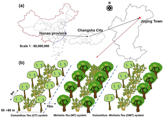 Location of the study area and experimental design. (a) The study site is located at the Jinjing town of Changsha city in the hilly region of north Hunan, China; (b) Experimental design of tea plantation.