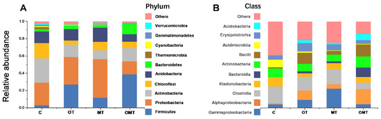 Furthermore, the 10 most abundant classes in the OMT system had the following trend: Clostridia (17.4%) > Bacilli (13.8%) > Actinobacteria (12.8%) > Bacteroidia (11.2%) > Alphaproteobacteria (7.3%) > Erysipelotrichia (7.0%) > Ktedonobacteria (6.6%) > Gammaproteobacteria (4.5%) > Acidobacteria (4.4%) > Acidimicrobiia (0.7%). Intercropping enhanced the abundance of Bacteroidia (99.5%), Erysipelotrichia (96.9%), Clostridia (93.5%), Actinobacteria (19.6%), while it decreased the Acidimicrobiia, Alphaproteobacteria, Ktedonobacteria and Acidobacteria by 1266.7%, 165.3%, 62.7% and 15.6%, respectively. In the three intercropping systems, Bacteroidia, Erysipelotrichia, Clostridia and Actinobacteria were increased by tea-tree positive interactions compared to the C system. The abundance of Bacteroidia in the four treatments was in the following sequence: OMT (11.2%) > OT (2.4%) > MT (2.0%) > C (0.1%). The abundance of Erysipelotrichia in the four treatments followed the trend of OMT (7.1%) > OT (3.2%) > MT (1.7%) > C (0.2%). The abundance of Clostridia in the four treatments had the following trend: OMT (17.4%) > OT (10.7%) > MT (5.4%) > C (1.1%). In addition, the abundance of Actinobacteria in the four treatments showed the following sequence: OMT (12.8%) > C (10.3%) > OT (8.8%) > MT (7.8%).