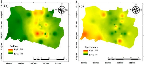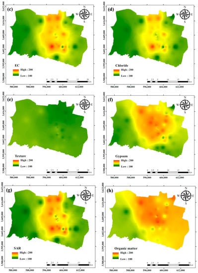 The summary statistics of soil parameters such as minimum, maximum, mean, and standard deviation are presented in Table 8. The EC values ranged from 2.5 to 174.7 ds/m in the study area. The Cl−, HCO3−, and Na+ concentrations varied from 17.5 to 2766 meq/L, 5 to 30 meq/L, and 4 to 10,946 meq/L, respectively. The average pH of the soil was 8, which is a weak alkaline soil with a small spatial variation. Moreover, the average organic matter and gypsum of soil samples was 0.5% and 9.5%, and their maximum was 14.6 and 16.5, respectively.