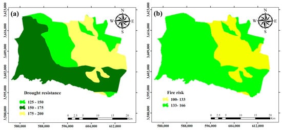 Spatial distribution of vegetation cover indicators: (a) Drought resistance indicator; (b) Fire risk indicator; and (c) Plant cover indicator.