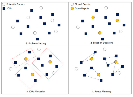 The LRP-SD is illustrated in Figure 1. The problem considers potential distribution center locations (circles) and the ICUs (squares). Figure 1 shows an initial solution setting (top-left), the selection of the depots to be opened (top-right), the allocation of ICUs to the opened depots (bottom-left), and the routing from the opened depot to its allocated ICUs (bottom-right) while satisfying the set of constraints.