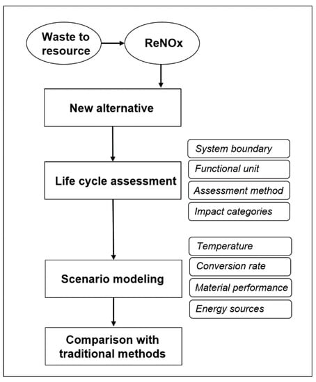To fill this gap, we carried out a life cycle assessment of ReNOx in the present study. The main objectives of this study are to uncover the key variables and explore trade-offs between impact categories of ReNOx for further potential technology improvement. The remainder of this paper is organized as follows. Section 2 describes the research framework, assessment methodology, and scenario modeling. Section 3 presents the results, interpretations, and implications. Section 4 presents the conclusions.