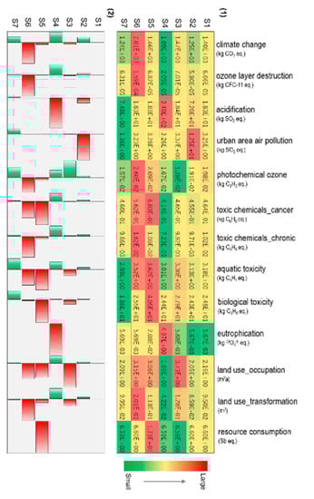 Figure 3 shows the environmental impacts of ReNOx technology. The color scale distinguishes the environmental impacts in different scenarios. Green with a smaller value represents improved performance, whereas red with a higher value represents a worse performance, as shown in Figure 3, (1). The increase or decrease rates of environmental impacts in S2–S7 comparing with that in S1 are shown in Figure 3, (2). In general, some impacts were increased; however, other impacts were simultaneously decreased relative to S1. Under S2, a lower conversion rate led to more NOx emissions, which is an important pollutant causing acidification and urban area air pollution. Consequently, acidification and urban area air pollution were significantly increased. However, several other impact categories especially for climate change and ozone layer destruction were simultaneously decreased. This can be attributed to the fact that the amount of energy consumption and final waste treatment were decreased. With respect to S3, the feedstock format in the conversion stage was changed from methane to carbon monoxide and hydrogen. The impact of land use was increased, while the photochemical zone was evidently decreased. When NH3 was released into the environment directly under S4, eutrophication and acidification were remarkably increased. As no final treatment is needed, almost all other impacts were decreased apart from the two impacts mentioned above. If the adsorption material capacity and reuse times were halved under S5, all impact categories were increased. The technical performance reduction caused increased demands for adsorption materials. These additional material consumptions can result in additional impacts. As for S6, under which the recovery rate was halved, climate change, ozone layer destruction, photochemical ozone, toxic chemicals (chronic), and land use were the largest among all scenarios. In the optimized scenario of S7, with a higher conversion rate and a renewable energy source, almost all impacts were decreased. The impacts of acidification, urban area air pollution, and aquatic and biological toxicity were minimal compared with those in other scenarios.