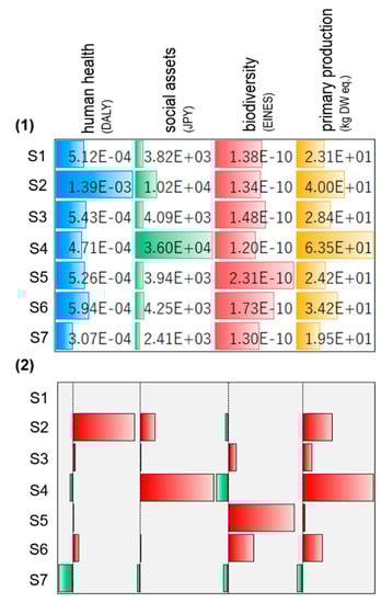 The life cycle impact assessment was conducted in Excel using the life cycle impact assessment method based on endpoint modeling (LIME2) and the IDEA database. LIME2 is a life cycle impact assessment method which reflects environmental and social conditions in Japan. The impacts of midpoint impact results, damage assessment results, and a final single indicator result are calculated. It can be used for the environmental assessment of products and technologies [31]. Its framework is shown in Figure 2. The impact categories include climate change (kg CO2 eq.), ozone layer destruction (kg CFC-11 eq.), acidification (kg SO2 eq.), urban area air pollution (kg SO2 eq.), photochemical ozone (kg C2H4 eq.), toxic chemicals (cancer) (kg C6H6 eq.), toxic chemicals (chronic) (kg C6H6 eq.), aquatic toxicity (kg C6H6 eq.), biological toxicity (kg C6H6 eq.), eutrophication (kg PO43− eq.), land use occupation (m2a), land use transformation (m2), and resource consumption (kg Sb eq.). The damage assessments cover the damage to human health (disability-adjusted life year; DALY), social assets (JPY), biodiversity (expected increase in the number of extinct species; EINES), and primary production (net primary production; NPP). Finally, four damage categories were integrated into the eco-index (JPY) to support an improved decision making.